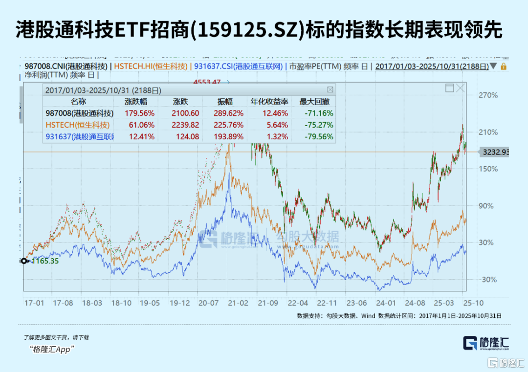 Wind数据露出,自2017年以来至2025年10月31日,国证港股通科技指数累计涨幅179.56%,同期港股通互联网、恒生科技指数涨幅12.41%、61.06%,露出出较强的成长弹性。